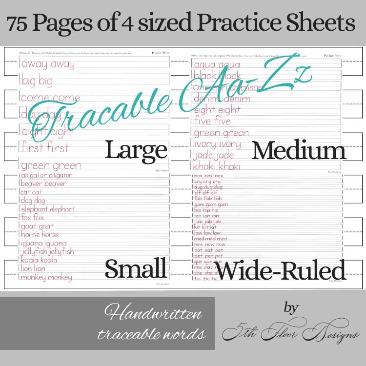 – 75 Practice Sheets with hand-written traceable letters, words, and steps.