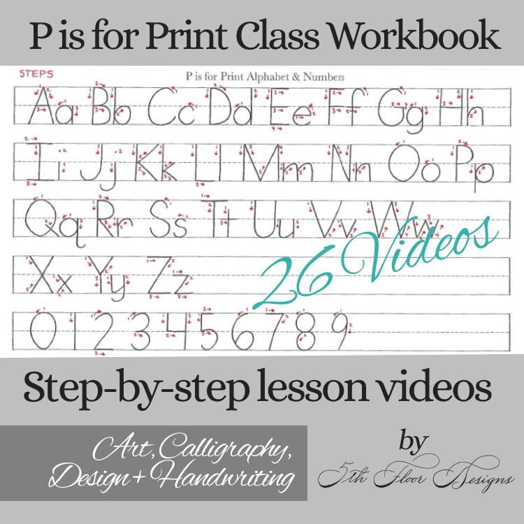 Work at your own pace to learn to hand write with me. Download my handwritten workbook, print off the pages, grab a pencil and begin learning to print with me in the 26 step-by-step P is for Print Handwriting Class video playlist.